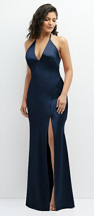 Plunge Halter Open-Back Maxi Bias Dress with Low Tie Back in midnight navy