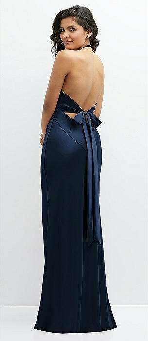 Pleated Halter Bias Satin Maxi Dress with Self-Tie Bow Back in midnight navy