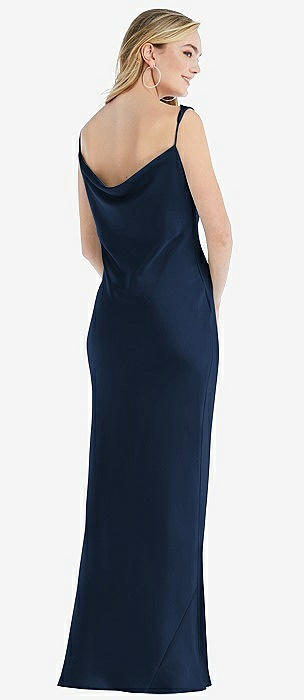Soft Cowl Neck Ruched Side Satin Bias Maxi Dress with Shoulder Bows in midnight navy