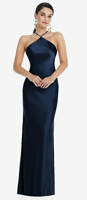 Draped Twist Halter Tie-Back Trumpet Gown in midnight navy