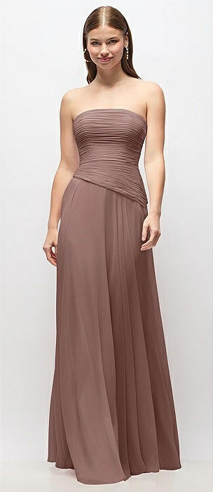 Strapless Chiffon Maxi Dress with Asymmetrical Ruched Drop Waist in sienna