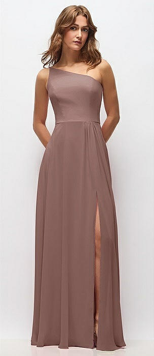 One-Shoulder Chiffon Maxi Dress with Shirred Front Slit in sienna