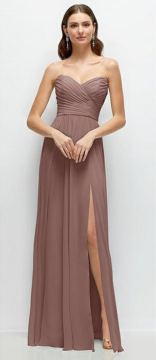 Strapless Pleated Surplice Chiffon Maxi Dress with A-Line Skirt in sienna