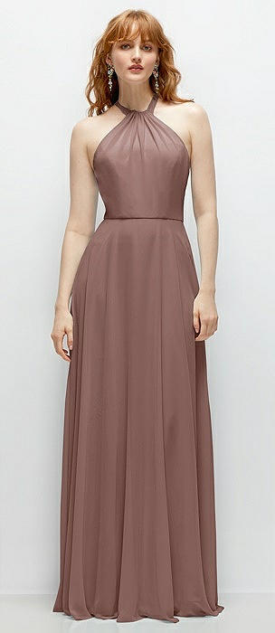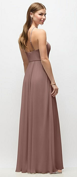 High-Neck Halter Chiffon Maxi Dress with Adjustable Spaghetti Straps in sienna
