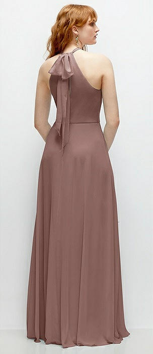 Shirred Halter Chiffon Maxi Dress with Back Sash-Tie Closure in sienna