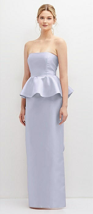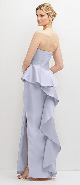 Strapless Satin Maxi Dress with Cascade Ruffle Peplum Detail in silver dove