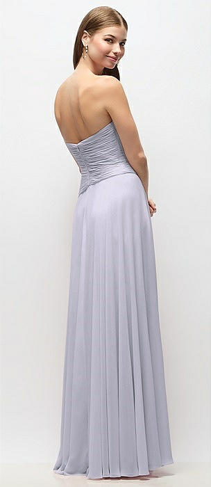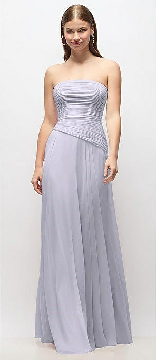 Strapless Chiffon Maxi Dress with Asymmetrical Ruched Drop Waist in silver dove