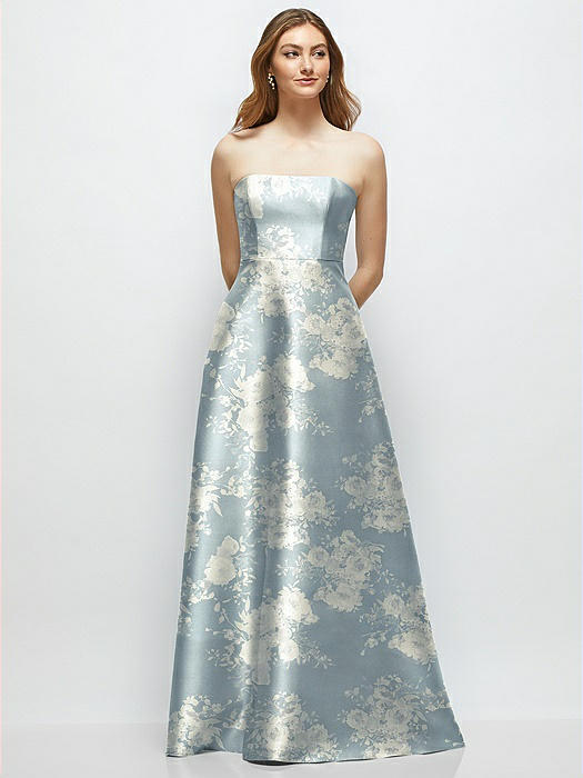 Strapless Floral Satin Gown with Full Skirt and Covered Buttons at Back in porcelain blue seraphina floral