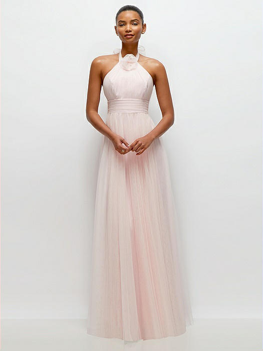 Tie-Back Halter Tulle Maxi Dress with Full Skirt & Rosette Detail in ballet pink