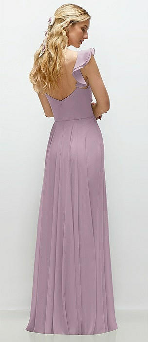 Bow-Shoulder V-Back Chiffon Gown with Front Slit in suede rose