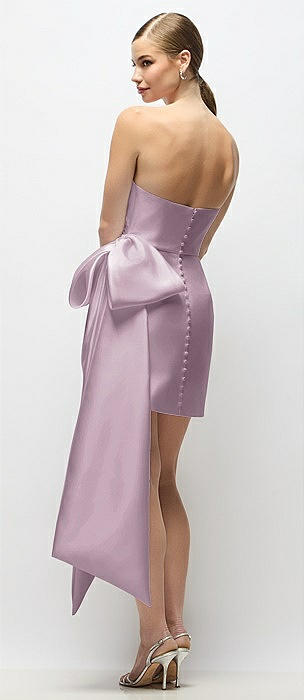 Strapless Pleated Draped Satin Mini Dress with Dramatic Long Tail Bow & Covered Buttons in suede rose