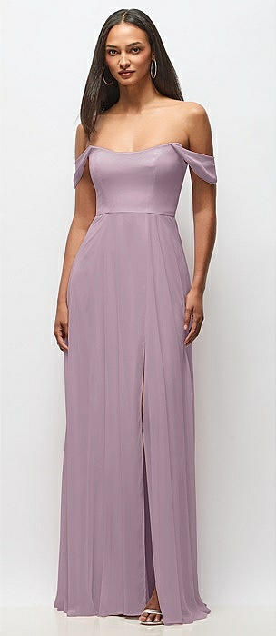 Off-the-Shoulder Basque Neck Maxi Dress with Flounce Sleeves in suede rose
