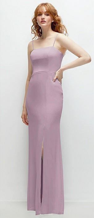 Spaghetti Strap Draped Skirt Gown with Front Slit in suede rose