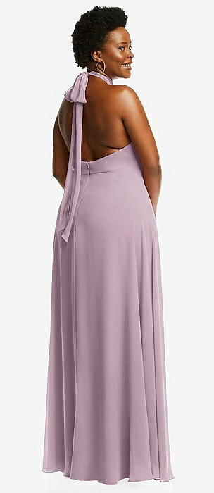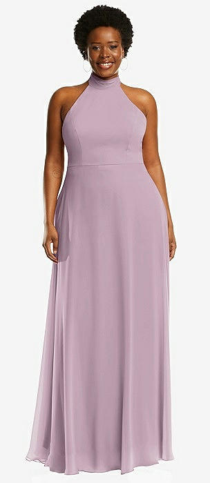 High-Neck Halter Open-Back Satin Trumpet Dress in suede rose
