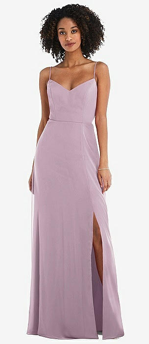 Spaghetti Strap Draped Skirt Gown with Front Slit in suede rose