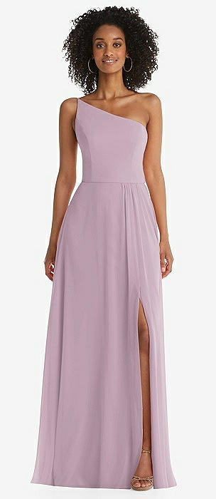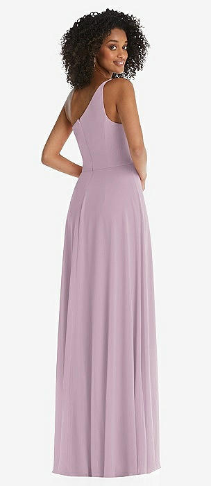One-Shoulder Chiffon Maxi Dress with Shirred Front Slit in suede rose