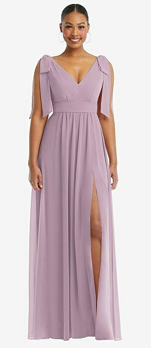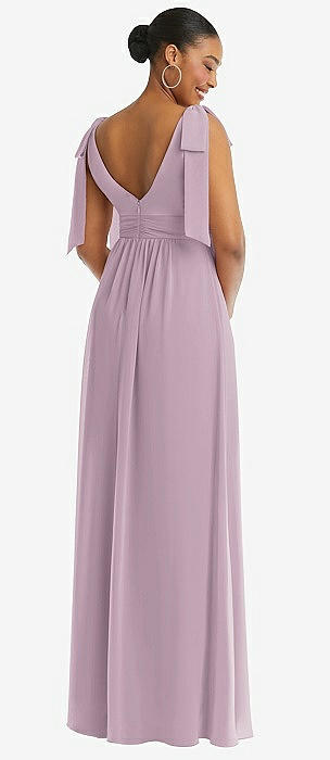 Plunge Neckline Bow Shoulder Empire Waist Chiffon Maxi Dress in suede rose