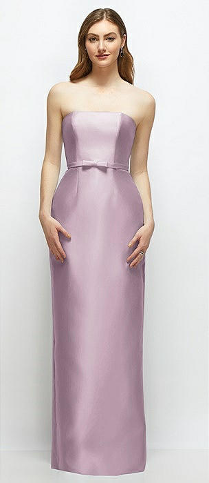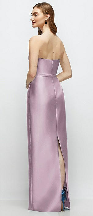 Strapless Satin Column Dress with Bow-Trimmed Skinny Belt in suede rose