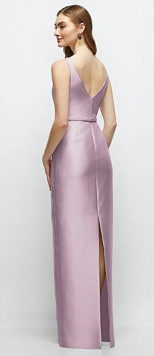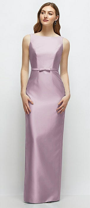 Bateau Neck Satin Column Dress with Bow-Trimmed Skinny Belt in suede rose