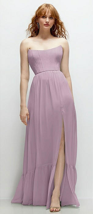 Strapless Cat-Eye Corset Maxi Dress with Ruffle Hem A-Line Skirt in suede rose