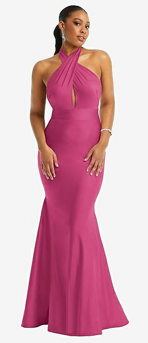 Criss Cross Halter Open-Back Stretch Satin Mermaid Dress in tea rose