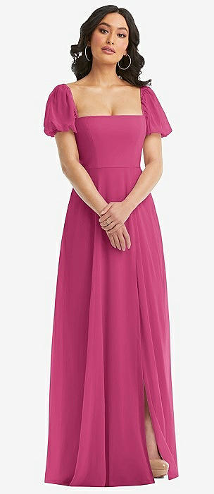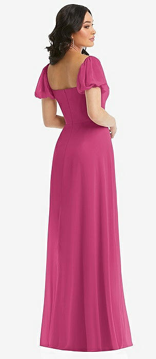 Puff Sleeve Chiffon Maxi Dress with Front Slit in tea rose