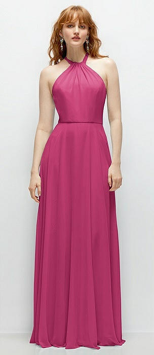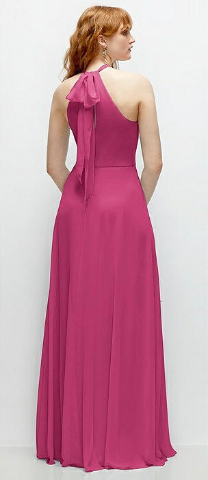 Shirred Halter Chiffon Maxi Dress with Back Sash-Tie Closure in tea rose