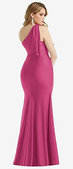 Cascading Bow One-Shoulder Stretch Satin Mermaid Dress with Slight Train in tea rose