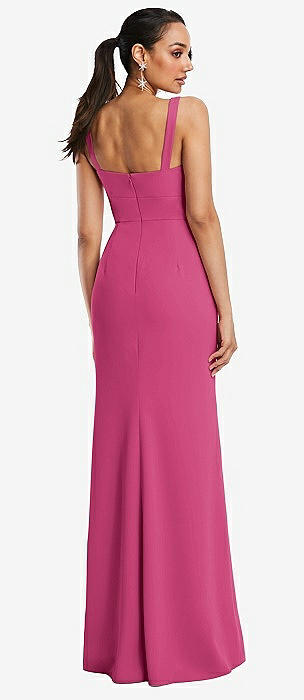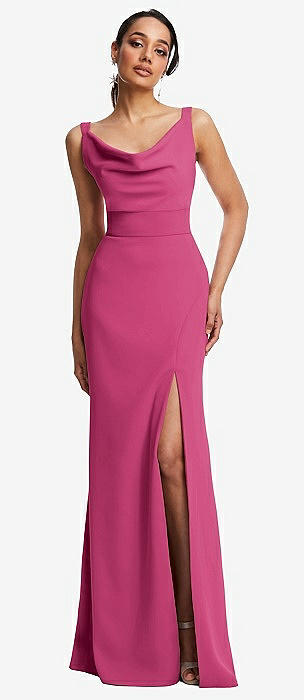 Cowl-Neck Wide Strap Crepe Trumpet Gown with Front Slit in tea rose