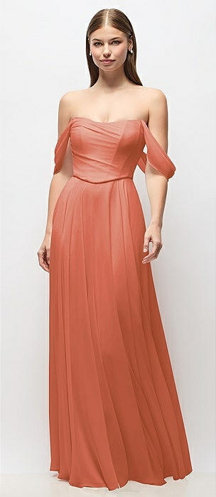 Off-the-Shoulder Basque Corset Chiffon Maxi Dress in terracotta copper
