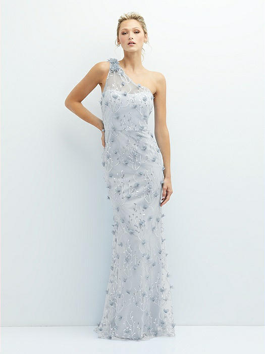 One-Shoulder Fit and Flare 3D Floral Embroidered Dress in silver dove