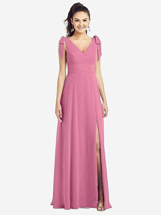 Bow-Shoulder V-Back Chiffon Gown with Front Slit in orchid pink