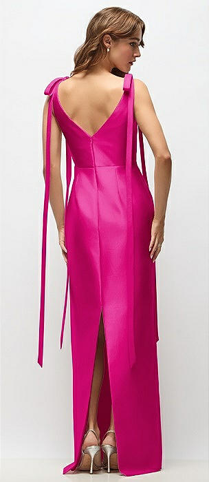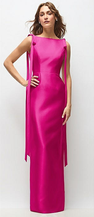 Bateau Neck Satin Column Maxi Dress with Exaggerated Tail Bow Straps in think pink