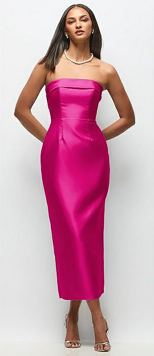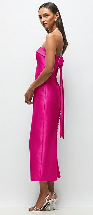Strapless Cuff Satin Midi Dress with Column Skirt & Back Bow in think pink