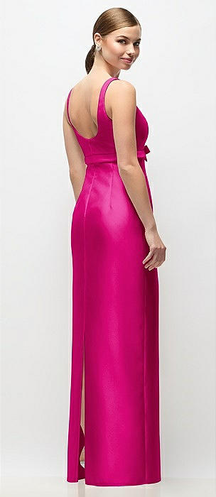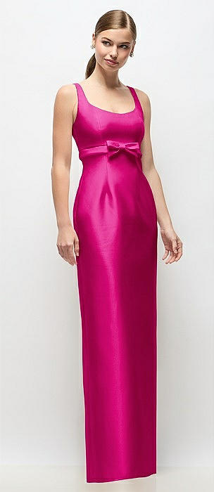 Scoop Neck Satin Column Maxi Dress with Bow at Empire Waist in think pink
