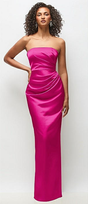 Strapless Draped Bodice Stretch Satin Column Maxi Dress in think pink