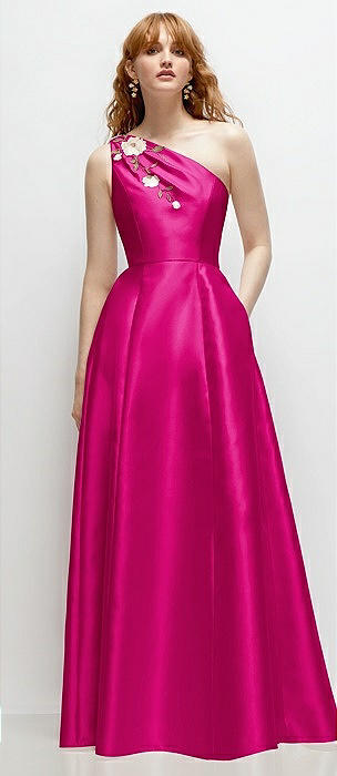 One-Shoulder Full A-Line Satin Gown with Handworked Floral Appliqué in think pink