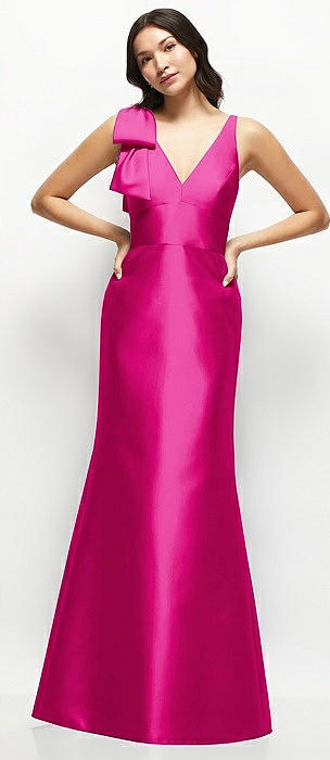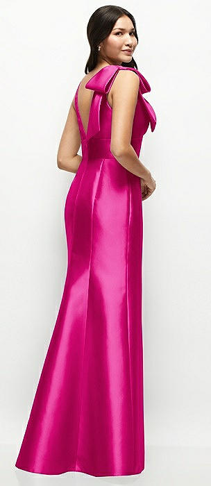Deep V-back Satin Trumpet Dress with Cascading Bow at One Shoulder in think pink