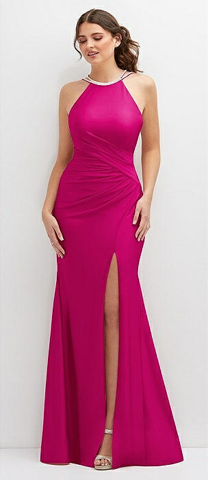 Shirred Skirt Jewel Neck Halter Dress with Front Slit in think pink