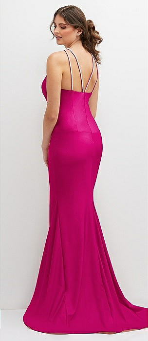 Halter Asymmetrical Draped Stretch Satin Mermaid Dress with Rhinestone Straps in think pink