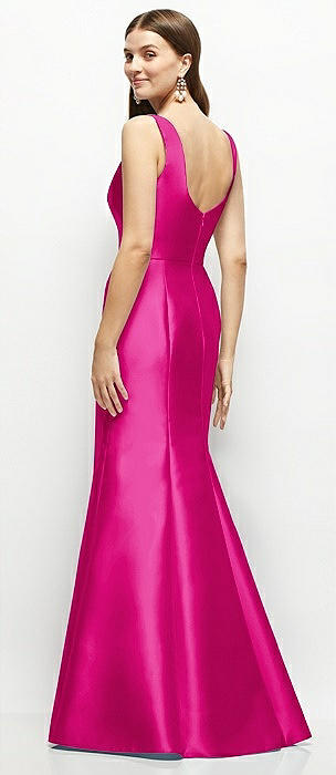 Deep V-back Satin Trumpet Dress with Cascading Bow at One Shoulder in think pink