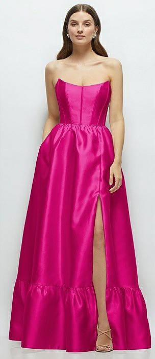 Strapless Cat-Eye Boned Bodice Maxi Dress with Ruffle Hem in think pink