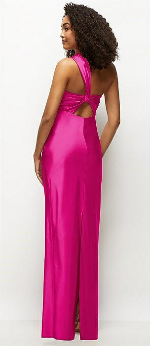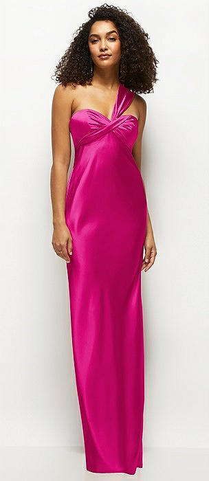 Satin Twist Bandeau One-Shoulder Bias Maxi Dress in think pink