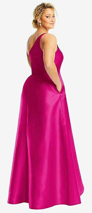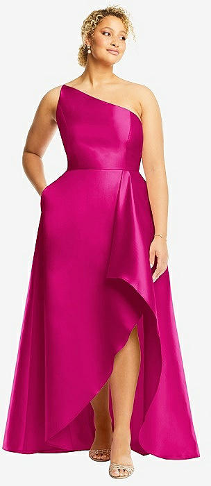 One-Shoulder Satin Gown with Draped Front Slit and Pockets in think pink