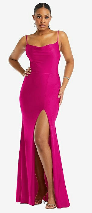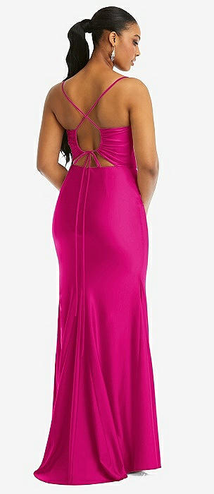 Cowl-Neck Open Tie-Back Stretch Satin Mermaid Dress with Slight Train in think pink