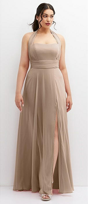 Shirred Skirt Jewel Neck Halter Dress with Front Slit in topaz
