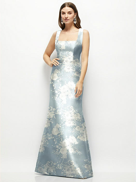 Strapless Cuff Neckline Floral Satin Trumpet Gown in cottage rose larkspur