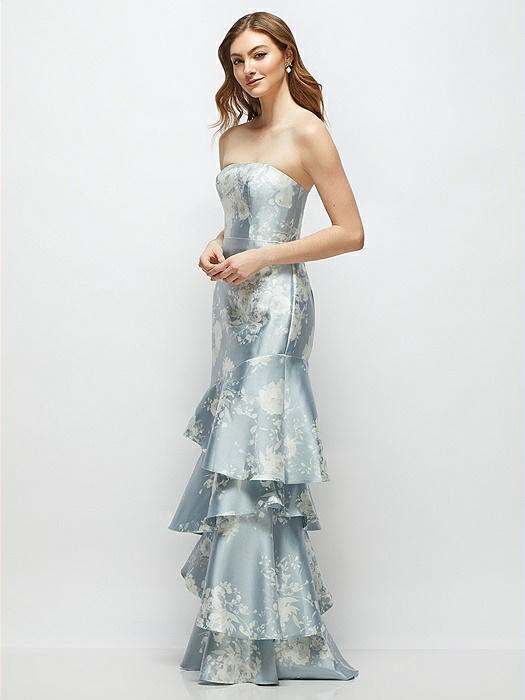 Floral Strapless Bodycon Maxi Dress with Tiered Ruffle Skirt in porcelain blue seraphina floral