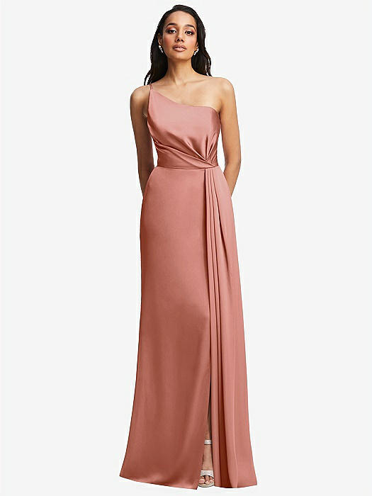 One-Shoulder Draped Skirt Satin Trumpet Gown in desert rose