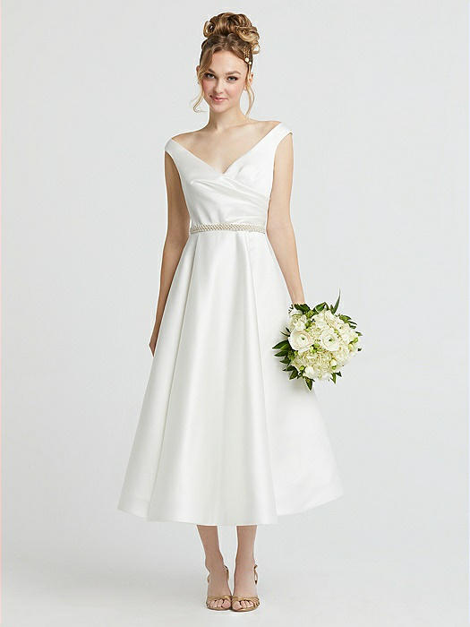 Draped Off-the-Shoulder Satin Wedding Dress with Beaded Belt in off white